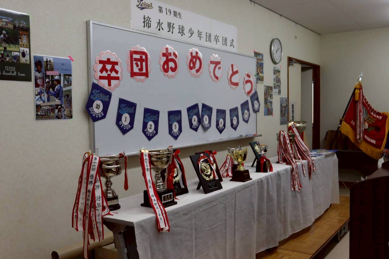会場には第19期生が勝ち取ってきた数々の大会の優勝旗や盾などが飾られました。