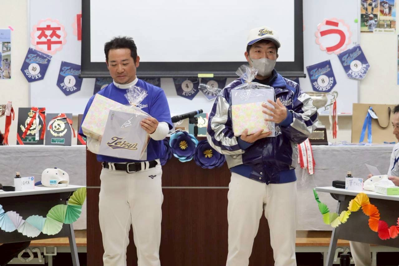 第19期生の卒団とともに、コーチを卒業するNコーチ、Yコーチに感謝の気持ちを込めて記念品が贈られました。長年に分かり、団員を優しく、そして時に厳しく指導してくださった両コーチ、本当にありがとうございました。